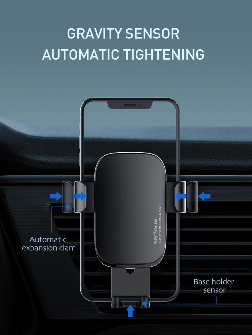 Suport auto telefon Gravity Serioux CH03, Material: ABS+ aluminium, mod de instalare: tip cataramă, poziție de fixare: aerisire, culoare: negru, potrivit pentru: telefon mobil