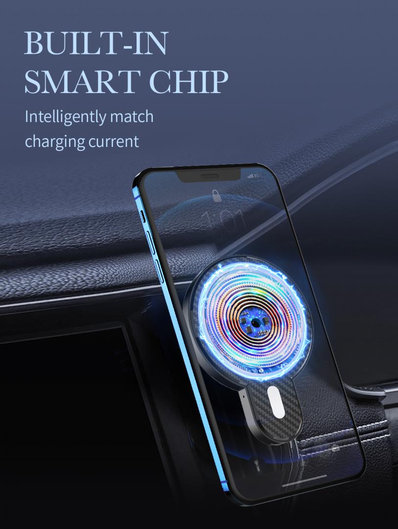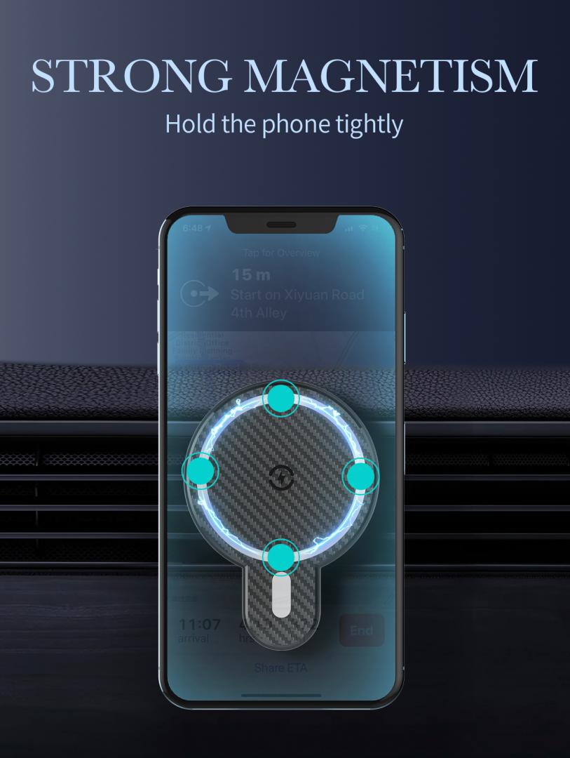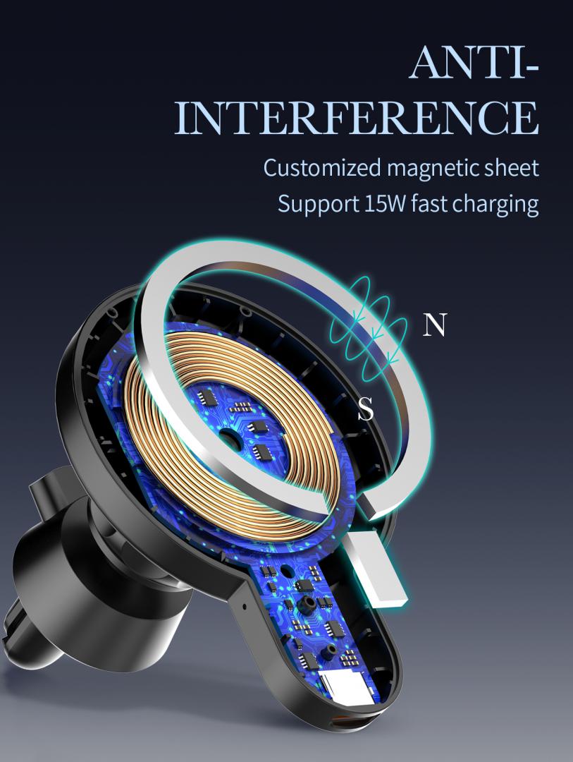 Suport Auto Telefon Serioux, cu incarcare Wireless 15W, compatibil MagSafe, prindere grila ventilatie, Intrare: 5V=2A 9V=2A, Ieșire: 5W 7.5W 10W 15W(Max), Dimensiuni: 61*84*71mm