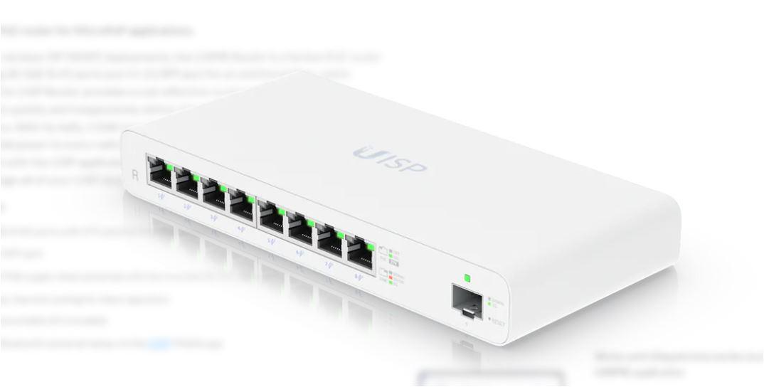 UBIQUITI UISP-R GIGABIT POE ROUTER pentru aplicatii MicroPOP, interfata: 8 x 10/1001000, 1 x 1G SFP, Procesor: Dual-core 880 MHz, MIPS1004Kc , Memorie: 512 Mb, Flash: 512Mb, Consum 10W, Passive POE 27VDC.