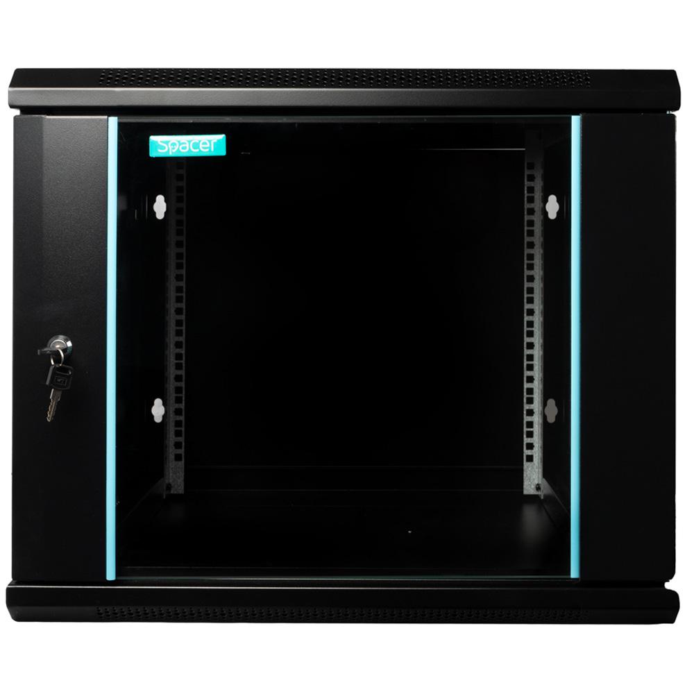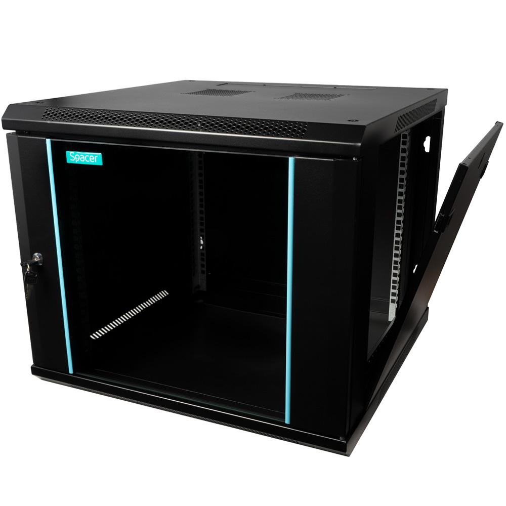 CABINET 19″ SPACER 9U 600x600mm, fixare pe perete, Flatpack (dezasamblat), Black, usa sticla cu blocare, panouri detasabile, otel 1.5mm, sarcina maxima 60Kg
