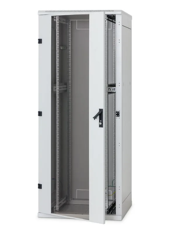 Capacitatea de 27U si adancimea de 1000 mm (peste 999 mm) permit instalarea echipamentelor variate, iar sinele verticale 19” ajustabile pe adancime simplifica montajul si managementul cablurilor. Usa frontala metalica perforata sustine ventilatia naturala, iar panourile laterale si spate detasabile faciliteaza interventiile rapide. Deschiderea usii la 165° si posibilitatea schimbarii sensului de deschidere ofera flexibilitate in orice configuratie.