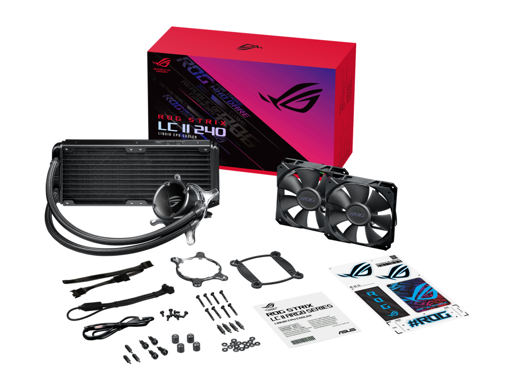 Asus CPU Liquid Cooler ROG Strix LC II 240 ROG STRIX LC II 240 Water Block Water block dimention: 80 x 80 x 45 mm Block Material (CPU Plate): Copper Radiator Radiator Dimension: 121 x 272 x 27 mm Radiator Material: Aluminum Tube: Sleeved Rubber tube Tube Length: 380 mm Fan Fan: ROG Designed Radiator Fan – Size: 2 x Fan Slots (120mm) – Dimension: 120 x 120 x 25 mm – Speed: 800 – 2500 RPM +/- 10% – Static Pressure: 5.0 mmH2O – Air Flow: 80.95 CFM / 137.5 m3h – Noise: 37.6 dB(A) – Control Mode: PWM/ DC Special Features AURA Sync Support: Yes Compatibility Intel: LGA 1700, 1200, 115x, 2011, 2011-3, 2066 AMD: AM4, TR4* Package Content 1 x Liquid Cooler (pre-applied thermal compound) 2 x 120 mm ARGB Radiator Fan 1 x USB cable for software control 1 x 1-to-2 Fan Splitter Cable 1 x Accessory Pack of Screws and Brackets 1 x Quick Start Guide 1 x ROG Sticker https://rog.asus.com/cooling/cpu-liquid-coolers/rog-strix-lc/rog-strix- lc-ii-240-model/