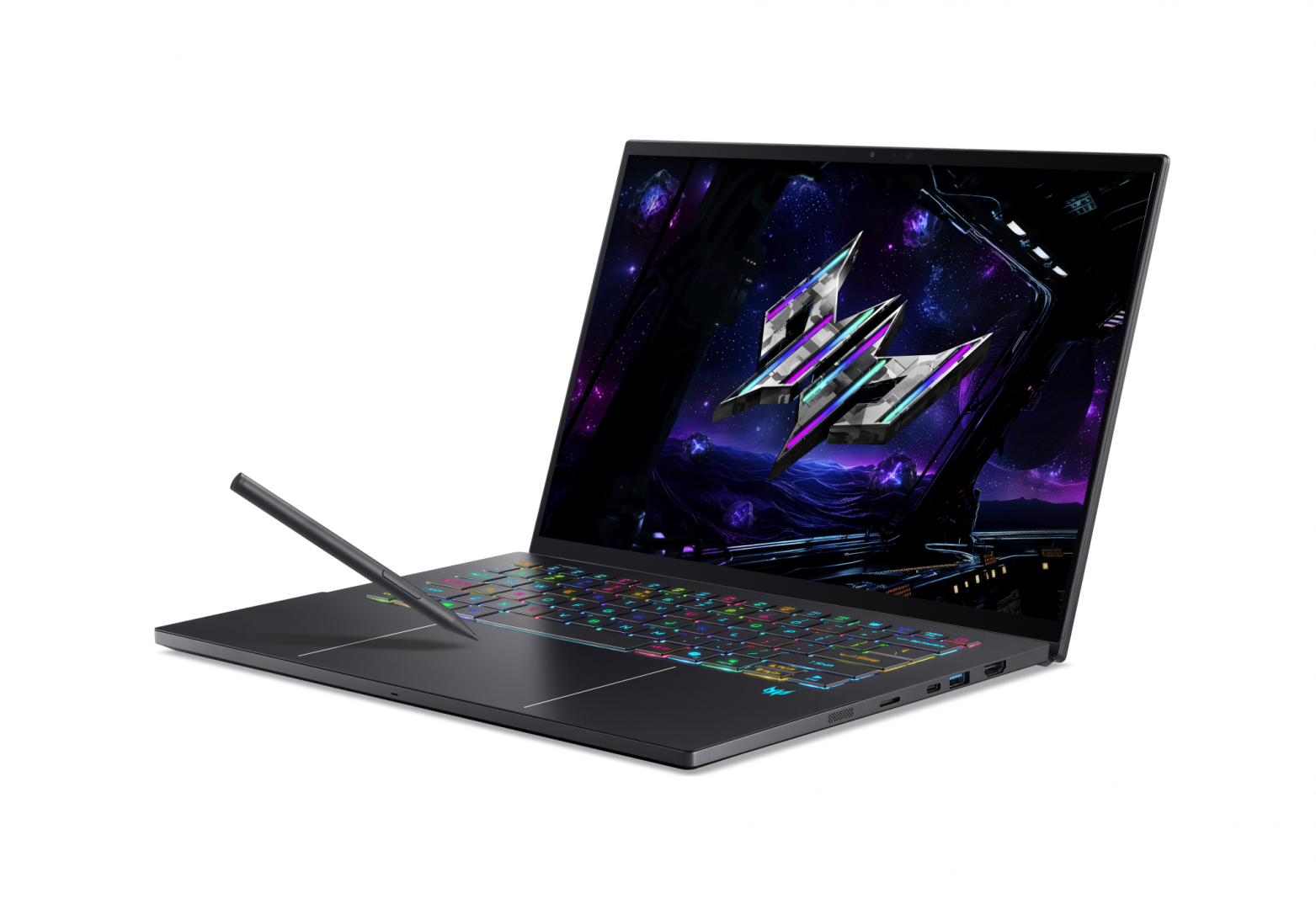 Laptop Gaming Predator Triton 14 AI PT14-52T-96TX, 14,5″ (36,83 cm), Acer CineCrystal™ WQ2.8K OLED 120Hz touch display with 100% DCI-P3 and 100% Adobe RGB color space coverage, 2880 x 1800, 16:10, Intel® Core™ Ultra 9 Processor 288V, 3.3 GHz base clock (up to 5.1 GHz max. boost clock), 12 MB Intel® Smart Cache, 4 Performance-cores + 4 Low-power Efficient-cores / 8 Threads, Intel® AI Boost (up to 48 TOPS), video NVIDIA® GeForce RTX™ 5070, 8GB GDDR7 VRAM, RAM 32 GB LPDDR5X (1 x 32 GB LPDDR5X (Onboard)), Bis zu 32 GB DDR5 RAM (2x 16 GB soDIMM), SSD 2TB M.2 PCIe Solid-State-Drive (SSD), no ODD, MicroSD Card reader, Six built-in stereo speakers, three built-in microphones, FHD IR Webcam, No LAN, WLAN Intel® Killer™ Wi-Fi 7 BE1750, Bluetooth® 5.4, Active Stylus Pen, No Fingerprint reader, Porturi: 4x (2x Type-C Gen 2, 2x Type-A Gen 2 (1x with Power Off USB Charging); 1x Thunderbolt™ 4 (via USB Type-C); 1x HDMI® 2.1; Displayport via USB Type-C; No Ethernet (RJ-45); 1x 3.5 mm speaker/headphone/line-out (supports headsets with integrated microphone), 140W power adapter (50% PCR-plastic), Baterie Li-Ion battery (4 cells / 76 Wh), Up to 7 hours (based on video playback test results), Backlit keyboard(Per-Key RGB backlit), Charcoal Black, Greutate 1.6 kg, Dimensiuni 321.79 x 221 x 17.31 mm (W x D x H), Windows 11 Professional