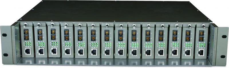 Specificație: „14 – Slot Media Converter Chassis SPEC: 14 – Slot – Rackmount FEATURE: Redundant Power Supply – Mounted Two Fans