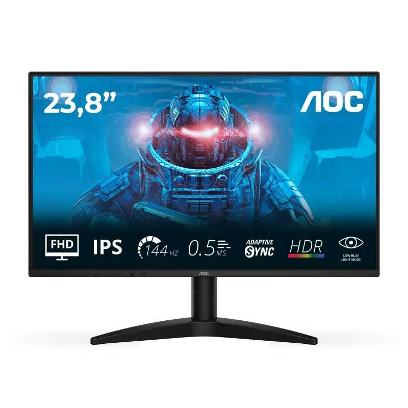 Monitor AOC 23.8″ 24B36X, Diagonal (inch): 23.8, Diagonal (cm): 60, Aspect ratio: 16:9, Panel: IPS, Resolution: 1920×1080, Refresh Rate: 144Hz, Response time GtG: 4ms, Response time MPRT: 0.5ms, Brightness (max): 300 cd/m², Contrast (static) : 1500:1, Contrast (dynamic): 20M:1, Viewing angle: 178/178, Color Gamut Type: Adobe RGB, Color Gamut Coverage: 0.916, Colours: 16.7M, VESA Wallmount: 100×100, Tilt: -5/+23, D-SUB: 0, HDMI: x1, DisplayPort: x1, AUX: x1 3.5mm Audio OUT