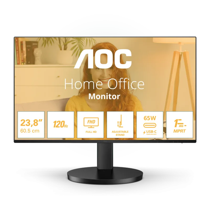 Monitor AOC 23.8″ 24B3CF2, Diagonal (inch): 23.8, Diagonal (cm): 60, Aspect ratio: 16:9, Panel: IPS, Resolution: 1920×1080, Refresh Rate: 120Hz, Response time GtG: 4ms, Response time MPRT: 1ms, Brightness (max): 300 cd/m², Contrast (static) : 1500:1, Contrast (dynamic): 20M:1, Viewing angle: 178/178, Color Gamut Type: Adobe RGB, Color Gamut Coverage: 0.878, Colours: 16.7M, Speakers: 2Wx2, VESA Wallmount: 100×100, Tilt: -5/+23, HAS: 110mm, D-SUB: 0, HDMI: x1, USB Hub: 2x USB Type-A, 1x USB Type-C, USB-C: x1, USB-C Power Delivery: 65W, AUX: x1 3.5mm Audio OUT