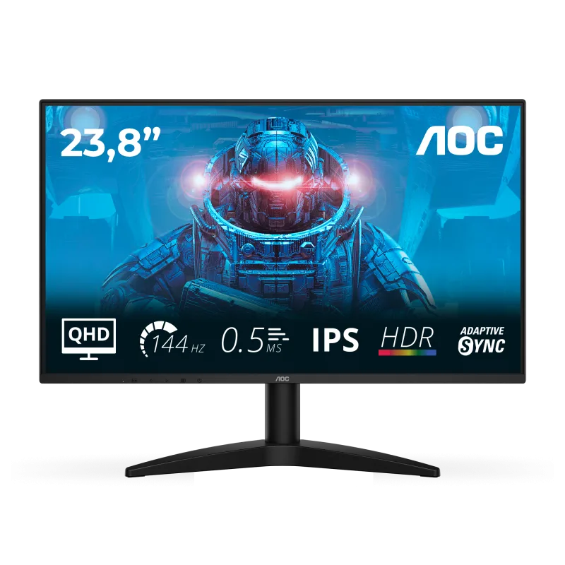 Monitor AOC 23.8″ Q24B36X, Diagonal (inch): 23.8, Diagonal (cm): 60, Aspect ratio: 16:9, Panel: IPS, Resolution: 2560×1440, Refresh Rate: 144Hz, Response time GtG: 4ms, Response time MPRT: 0.5ms, Brightness (max): 300 cd/m², Contrast (static) : 1300:1, Contrast (dynamic): 20M:1, Viewing angle: 178/178, Color Gamut Type: Adobe RGB, Color Gamut Coverage: 0.987, Colours: 16.7M, VESA Wallmount: 100×100, Tilt: -5/+21, D-SUB: 0, HDMI: x1, DisplayPort: x1, AUX: x1 3.5mm Audio OUT