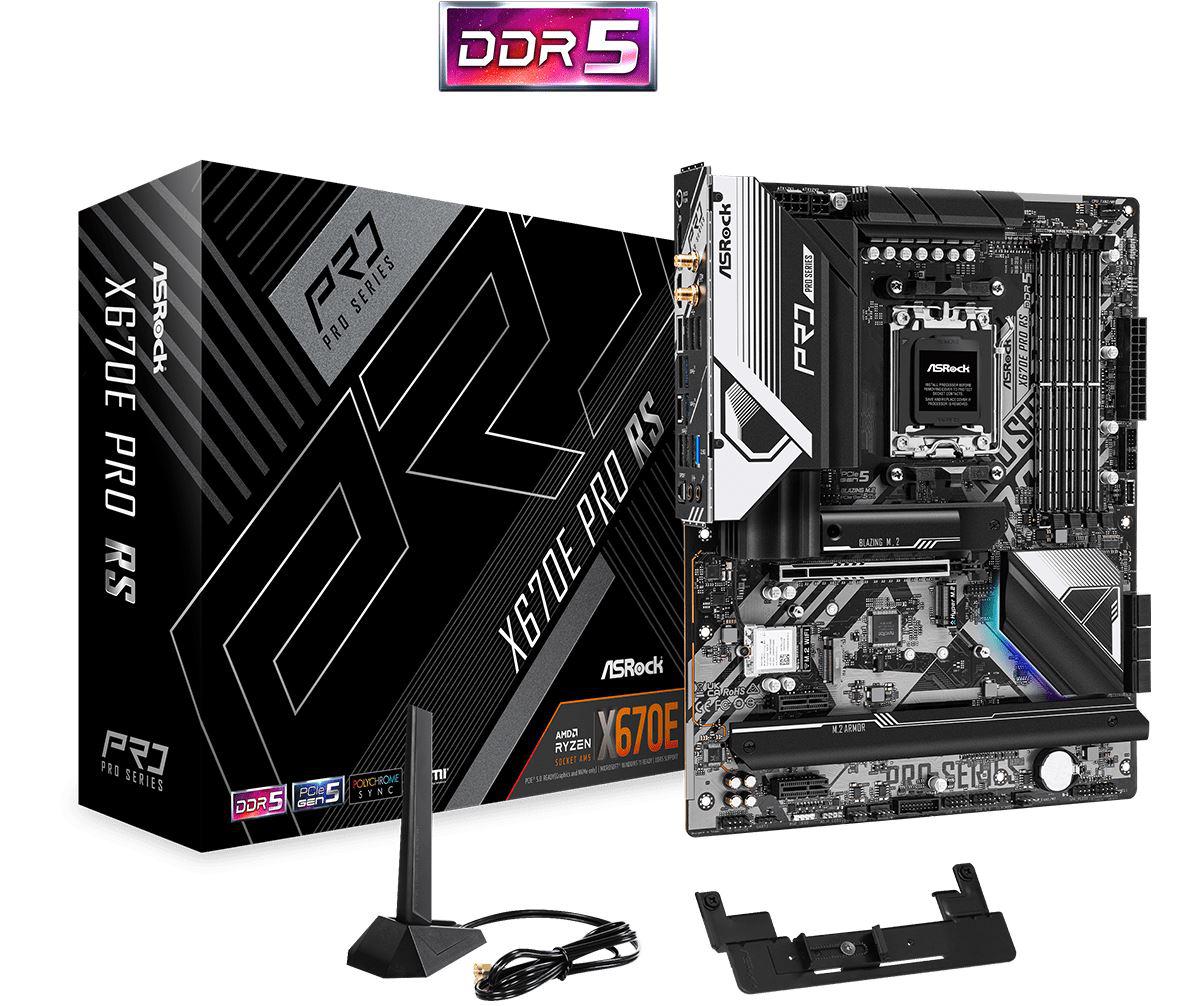 Placa de baza AsRock Socket AM5, X670E Pro RS Supports AMD Ryzen™ 7000 Series Processors 14+2+1 Phase Power Design, SPS 4 x DDR5 DIMMs, supports up to 6600+(OC) 1 PCIe 5.0 x16, 2 PCIe 4.0 x1, 1 M.2 Key-E for WiFi Graphics Output Options: 1 HDMI, 1 DisplayPort 7.1 CH HD Audio (Realtek ALC897 Audio Codec), Nahimic Audio 1 Blazing M.2 (PCIe Gen5x4), 3 Hyper M.2 (PCIe Gen4x4), 1 M.2 (PCIe Gen3x2 & SATA3), 6 SATA3 1 USB 3.2 Gen2x2 Type-C (Front), 1 USB 3.2 Gen2 Type-C (Rear), 1 USB 3.2 Gen2 Type-A (Rear), 8 USB 3.2 Gen1 (4 Rear, 4 Front), 8 USB 2.0 (4 Rear, 4 Front) Realtek 2.5G LAN 802.11ax Wi-Fi 6E + Bluetooth802.11ax Wi-Fi 6E + Bluetooth