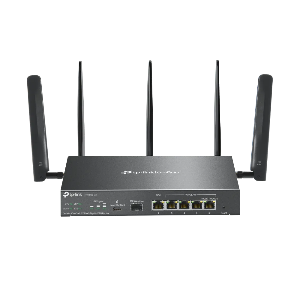 „Omada 4G+ Cat6 AX3000 Gigabit VPN Router PORT: 1× Gigabit SFP WAN/LAN Port – 1× Gigabit RJ45 WAN Port – 4× Gigabit