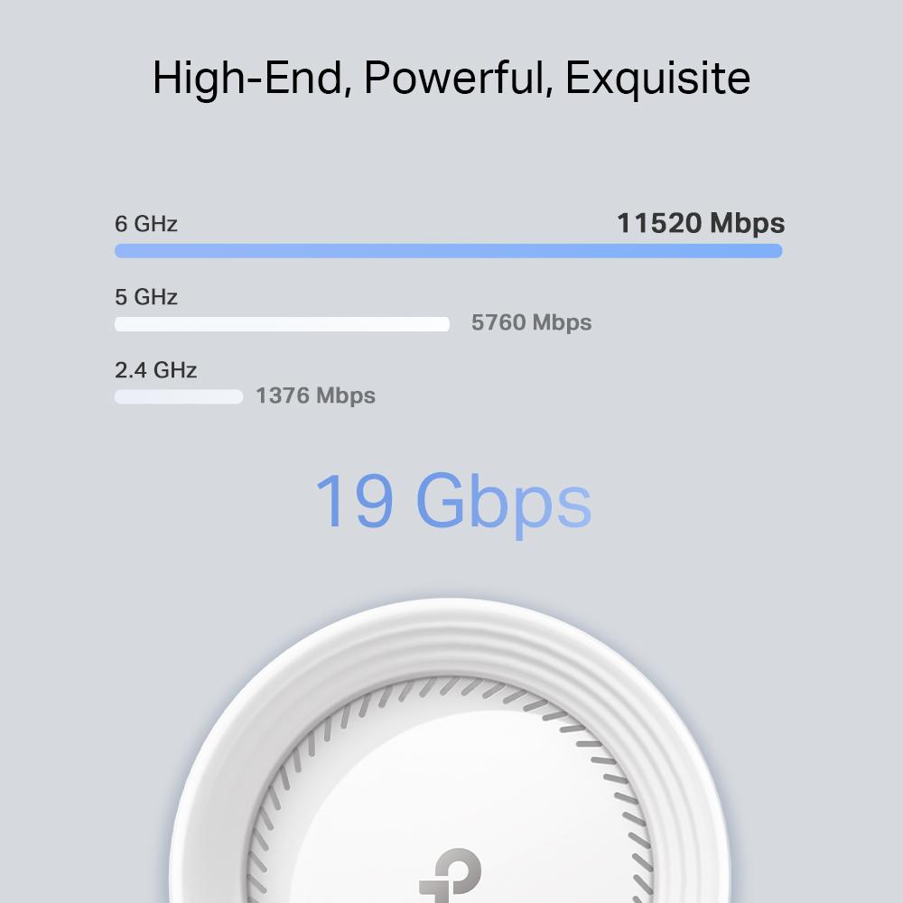 TP-LINK DECO BE85(2-PACK) Sistem Mesh WI-FI 7, BE19000, TRI-BAND, Standarde wireless: IEEE 802.11be/ax 6 GHz, IEEE 802.11be/ax/ac/n/a 5 GHz, IEEE 802.11be/ax/n/b/g 2.4 GHz, Viteze wireless: BE19000 6 GHz: 11520 Mbps (802.11be), 5 GHz: 5760 Mbps (802.11be), 2.4 GHz: 1376 Mbps (802.11be), 8 x antene interne, AI-Driven Mesh, 4×4 MU-MIMO, OFDMA, Modul router, Mod Access Point, Interfata: 1× 10 Gbps, 1× 10 Gbps SFP+/RJ45 Combo, 2× 2.5 Gbps Gbps per unitate DECO, 1× port USB 3.0, detecție automată WAN/LAN, Dimansini: 128 × 128 × 236 mm.