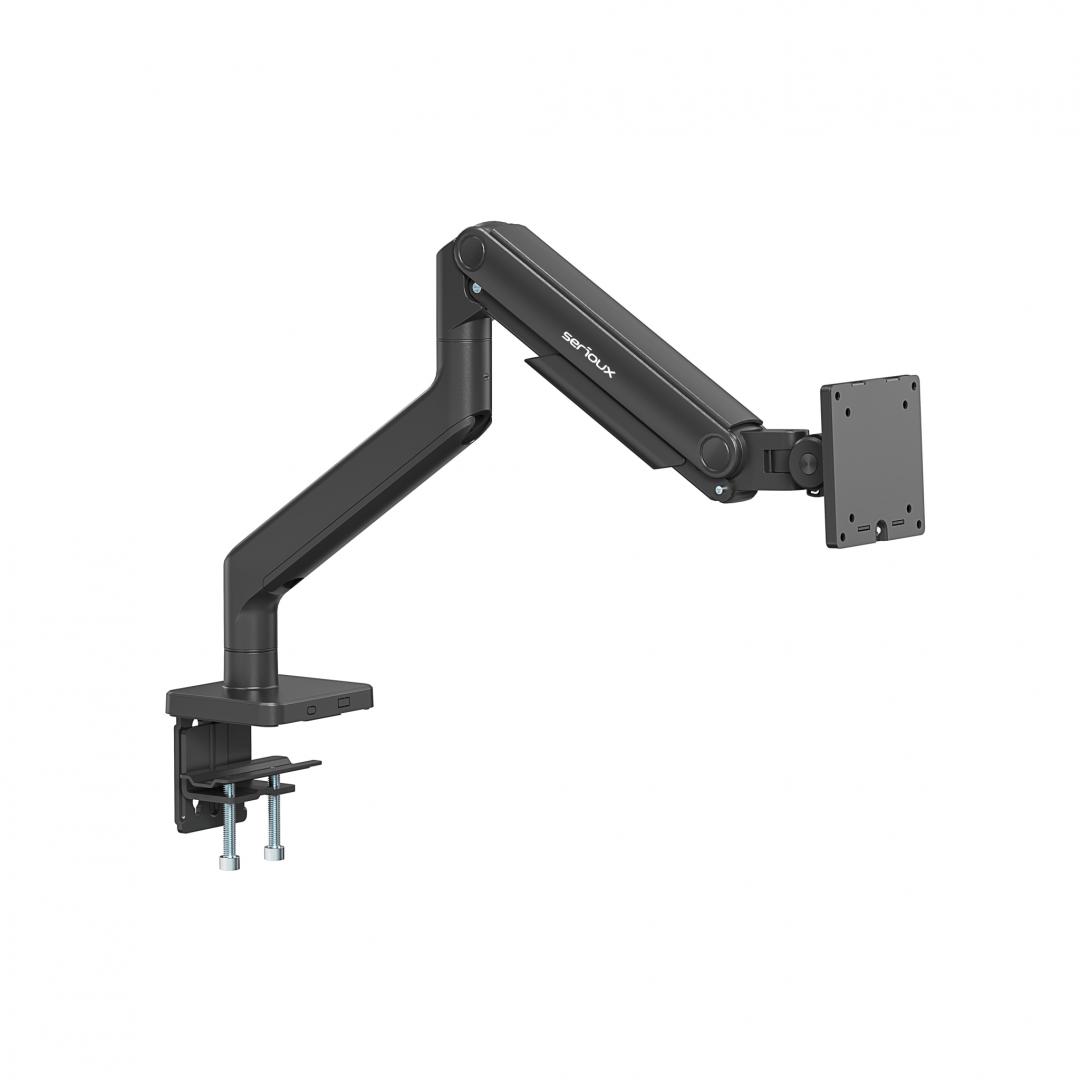 Brat monitor Serioux, tehnologie arc, compatiibilate ecran 17″-49″, greutate maxima suportata (per ecran) 2~20kg ,VESA:75×75,100×100, interval inclinare +50°~-20°, interval pivotare +90°~-90°