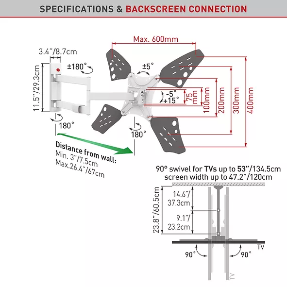 Suport perete Barkan TV, Ajustare pe 3 axe, 3400LW.W, 40″-70″, VESA max 600x400mm, alb