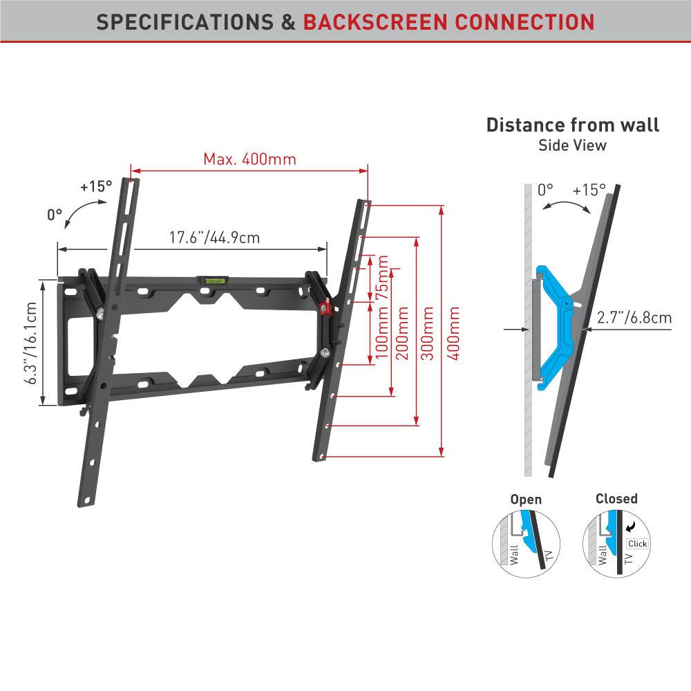 Suport TV de perete Barkan, pentru ecrane de pana la 13″ – 65″, greutate maxima suportata 36kg, distanta fata de perete 80mm – 205mm, VESA max. 400×400 mm, negru