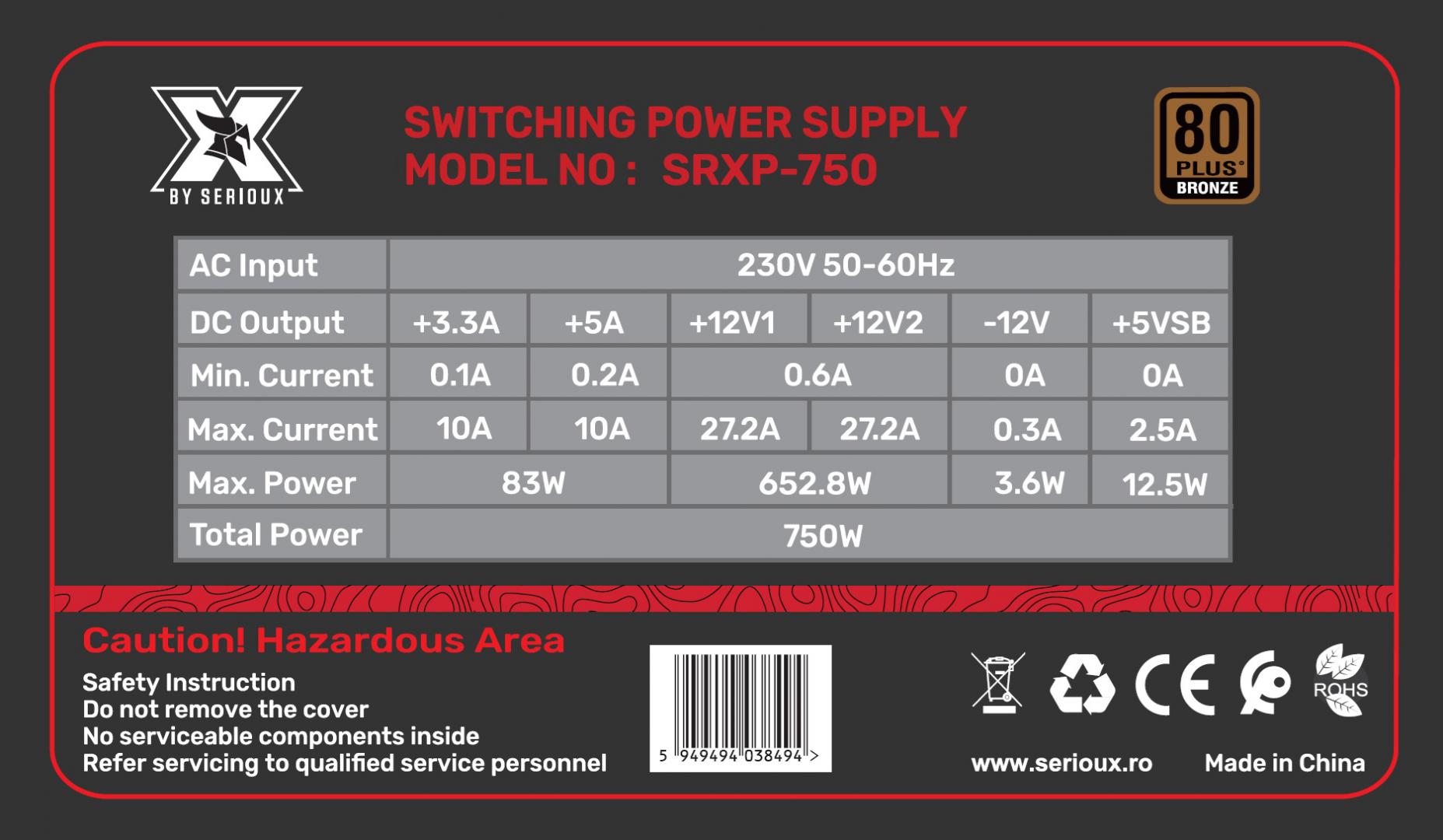 Specificație: Sursa Serioux Energy 750W, 80+ Bronze, Ventilator 12cm, Atx, Material