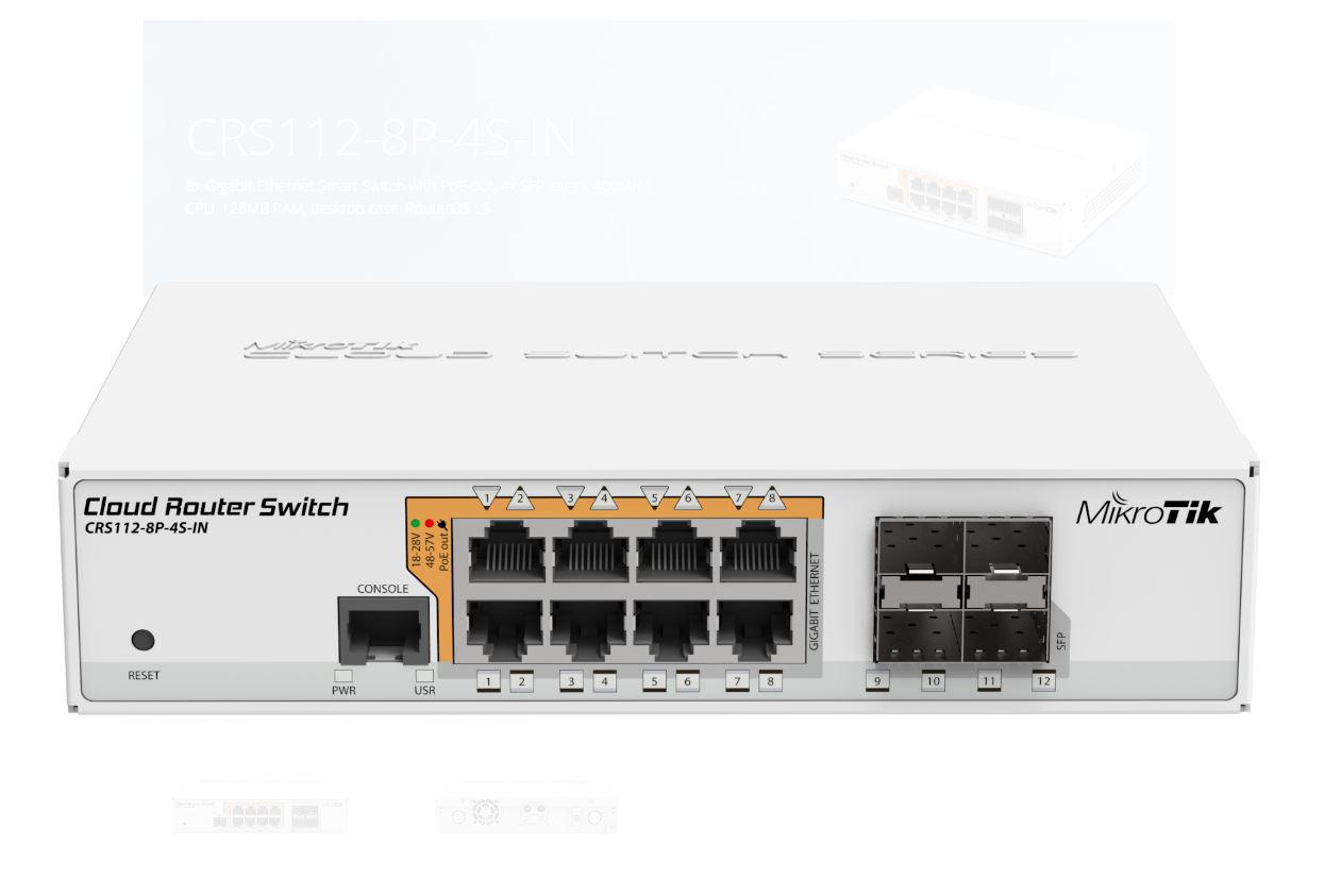 MikroTik Cloud Router Switch 112-8P-4S-IN with QCA8511 400Mhz CPU, 128MBRAM, 8xGigabit LAN with PoE-out, 4xSFP, RouterOS L5, desktop case, PSU
