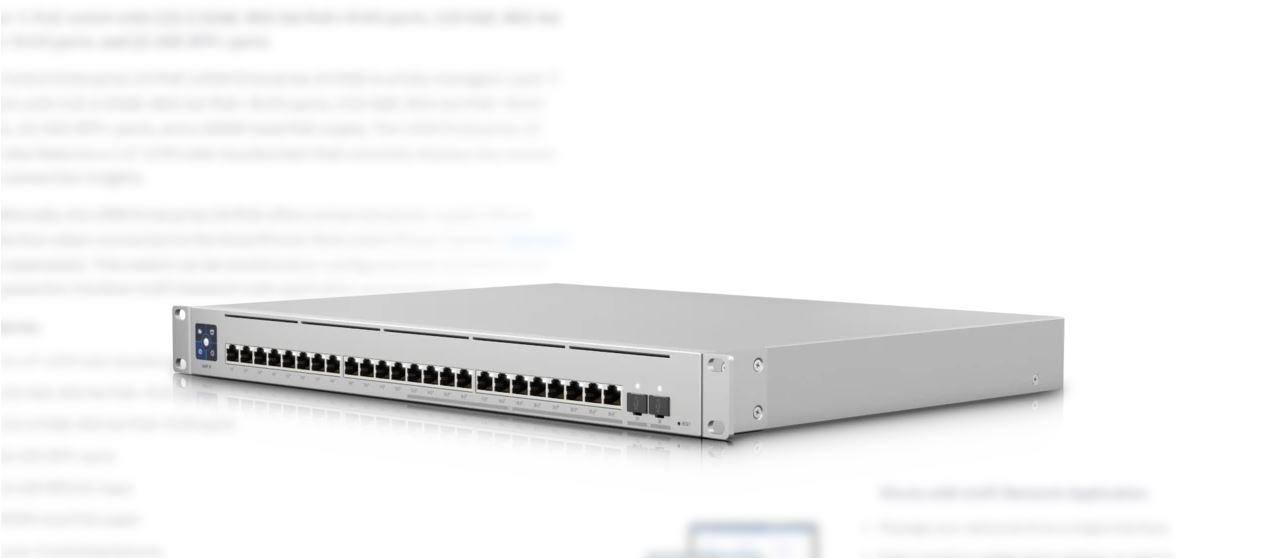 Ubiquiti UniFi Switch, USW-ENTERPRISE-24-POE, (12) 10/100/1000 Mbps RJ45, (12) 100/1000/2500 Mbps RJ45, (2) 1/10G SFP+, (24) PoE+ IEEE 802.3af/at (Pins 1, 2+; 3, 6-), 400W total PoE capacity, Switching Capacity: 124 Gbps.