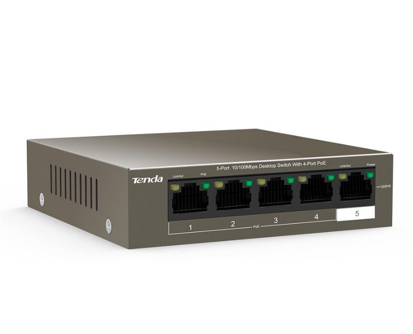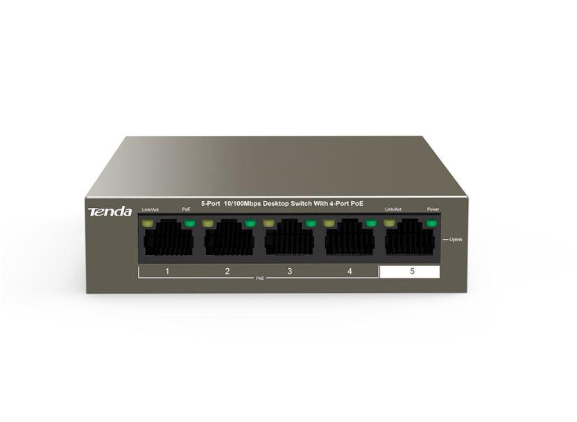 Tenda switch TEF1105P-4-38W, 5-Port 10/100Mbps, 4-porturi POE, Standarde de retea: IEEE 802.3、 IEEE 802.3u、IEEE 802.3x、 IEEE 802.3af, interfata: 4*10/100 Base-TX Ethernet Ports(Data/Power), 1*10/100 Base-TX Ethernet Port(Data), Dimensiuni: 100.0mmx100.0mmx26.0mm, Switch capacity: 1Gbps, buget POE: 35W.