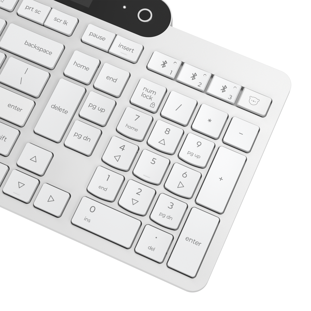 Tastatura Lenovo 800 Self-Charging Bluetooth; reincarcabila cu ajutorul luminii ambientale, fara spatiu destinat bateriilor clasice; layout: US; conectivitate: BT 5.1, se poate conecta la 3 dispozitive; greutate: 635g; compatibil cu Windows 10, Windows 11; culoare: alb