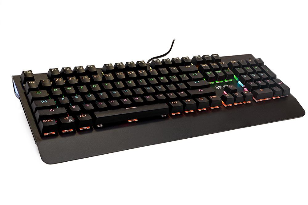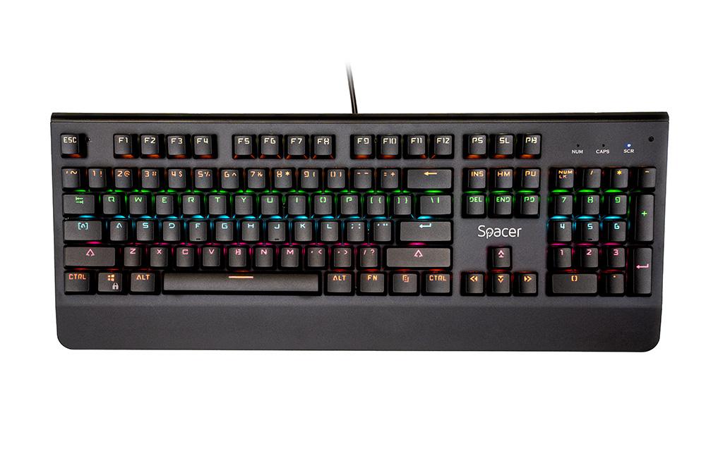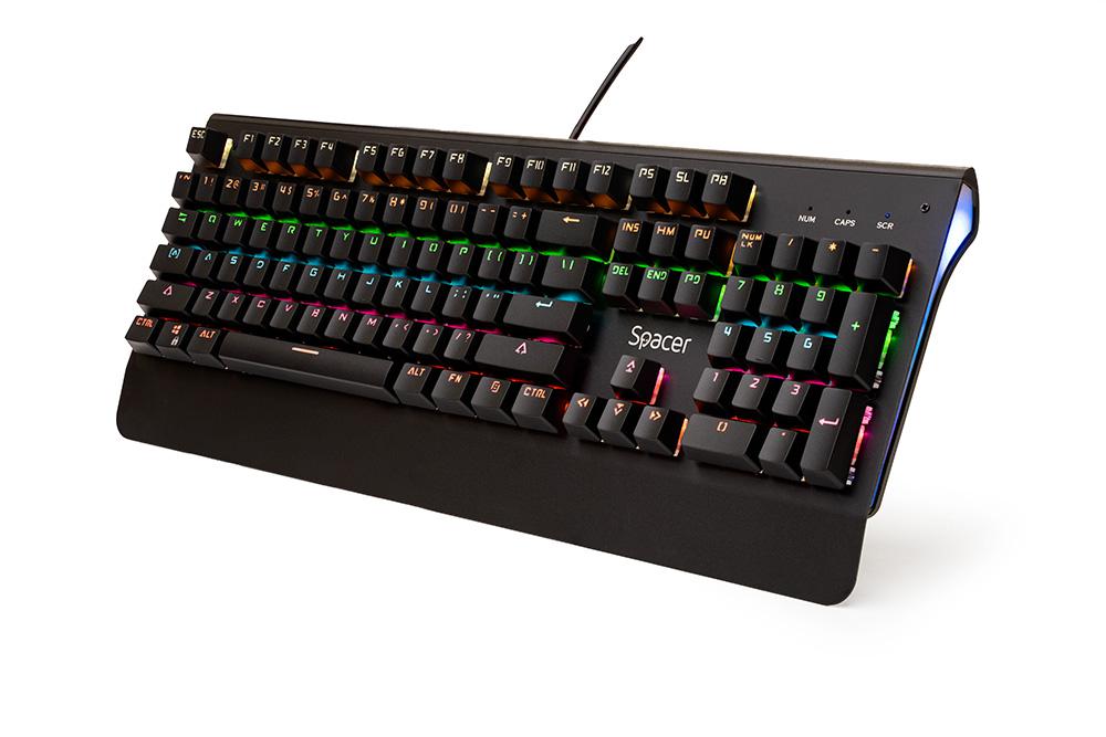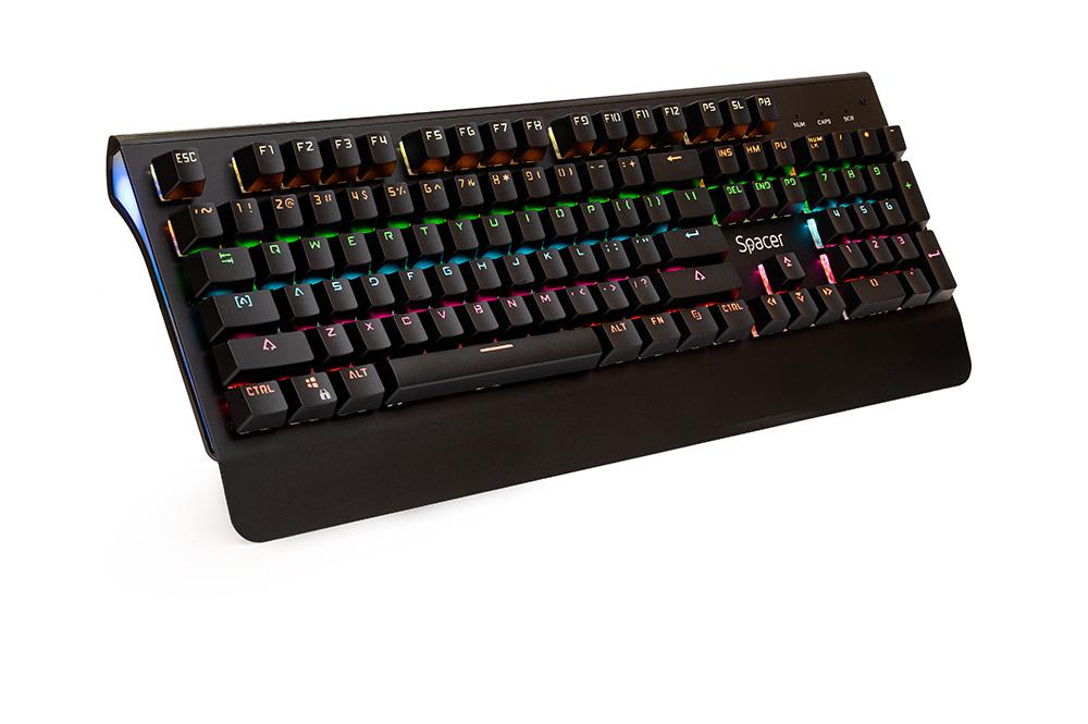 Tastatura Spacer SPKB-MK-01 cu fir, USB, switch-uri mecanice albastre, 50 mil. apasari, 104 taste, anti-ghosting 26 taste, anti-spill, palm rest metalic, black